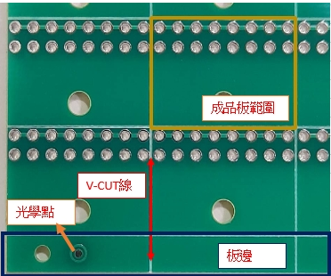 但是當板子內沒有可供固定板子用的鑽孔,而且也不允許額外鑽孔來固定電路板時,可以將板子外加一定範圍的面積 (我們稱為板邊),在板邊鑽可供固定板子用的孔來做定位,待成型完成後再使用V-CUT將外加的板邊切割後折掉。