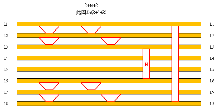 下圖為 2+N+2 (2+4+2) 的PCB 層疊結構(IPC-2226 標准定義為 Type III)